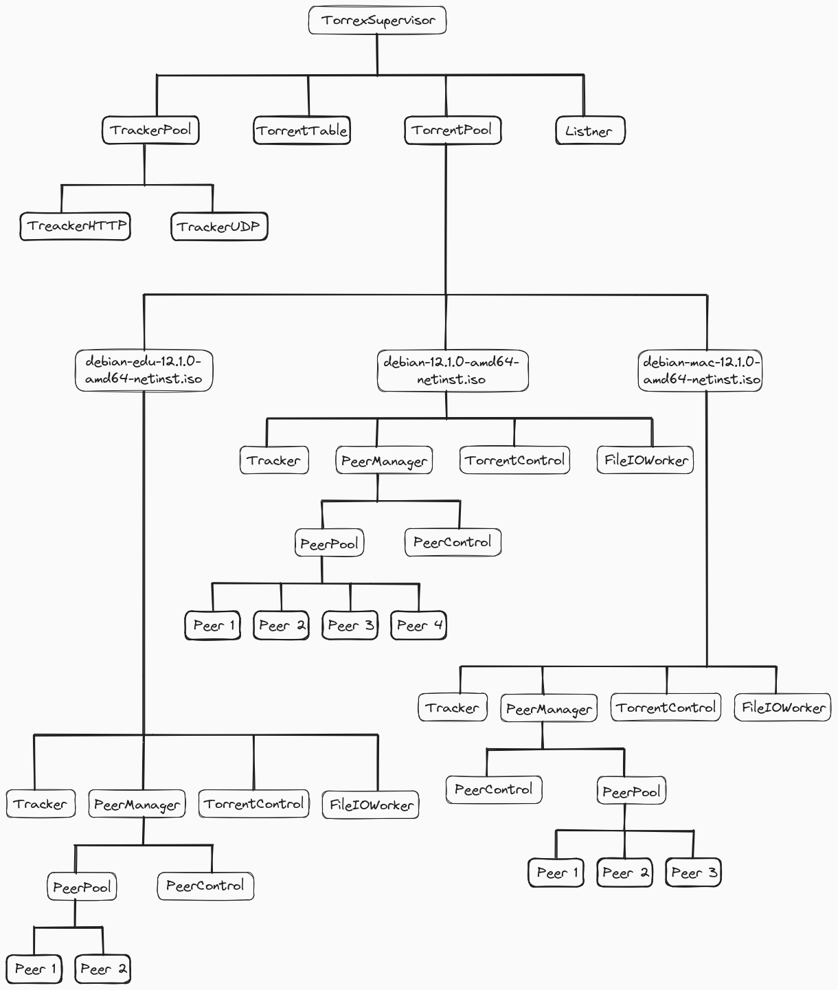When we add a torrent to our client, we spawn a supervisor instance of TorrentSupervisor just to manage this torrent. The supervisor further spawns a Tracker GenServer for communicating with the tracker, a PeerManager Supervisor to spawn PeerWorker GenServers through the PeerPool, and FileIOWorker GenServer to write or read the file on disk. Our supervision tree looks somewhat like this: